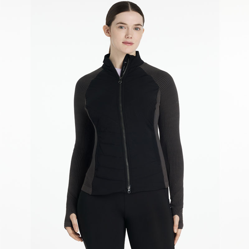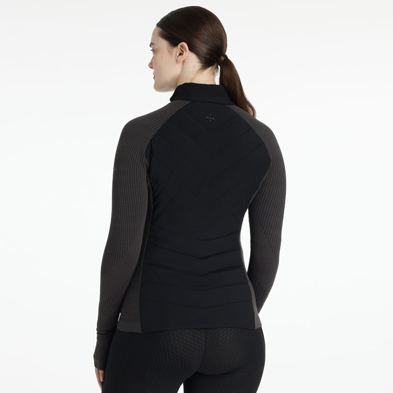 Veste LeMieux Maddie Noire. Une veste hybride confortable et légère pour femme, avec des empiècements matelassés devant et derrière. Les manches et les deux côtés sont en maille extensible. La veste présente une coupe ajustée et est ornée du logo LeMieux.
