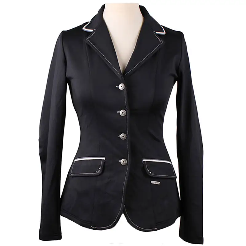 Veste d'équitation softshell confortable pour femme de la marque QHP. La veste est sportive et possède une fermeture éclair cachée sous la fermeture à boutons, un passepoil blanc sur le col, les poches et le dos, des surpiqûres contrastées, des poches à rabat et des strass sur les revers, les poches et la fente.