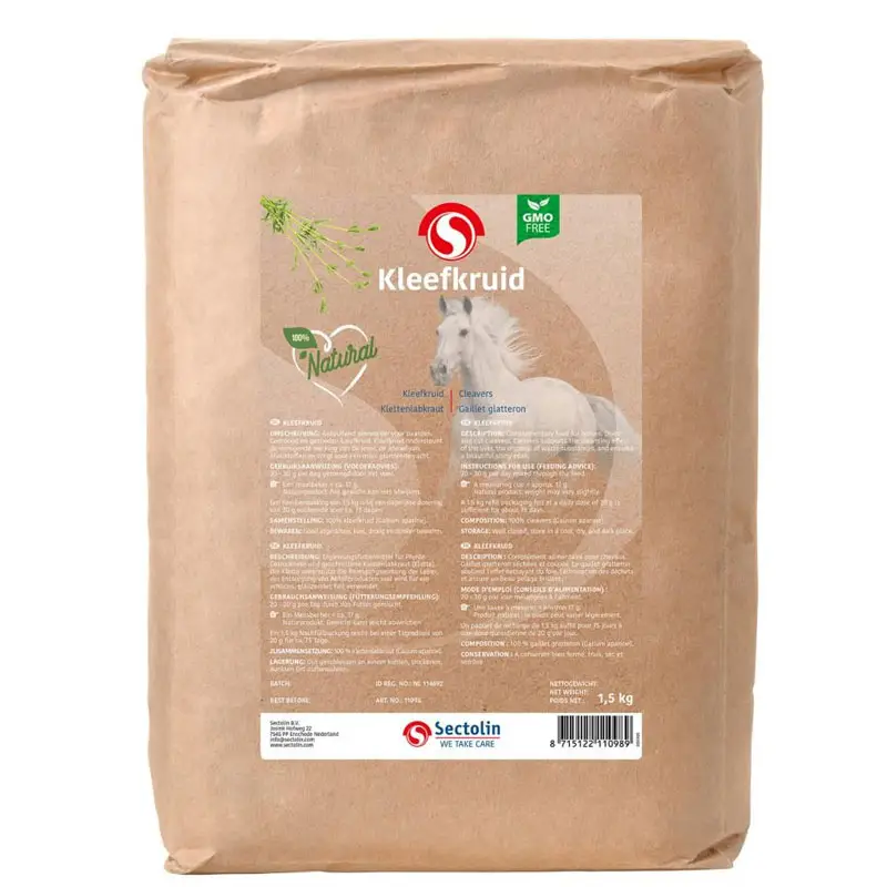 Sectolin hachereau recharge 1,5 kg est un aliment complémentaire pour chevaux. L'herbe adhésive soutient l'effet nettoyant du foie, l'élimination des déchets et assure un beau pelage brillant. 100% gaillet gratteron (Galium aparine).
